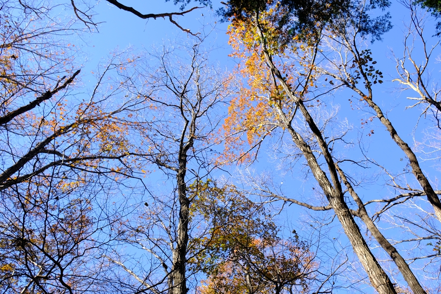 林の中を進みます。見上げれは梢の先に紅葉