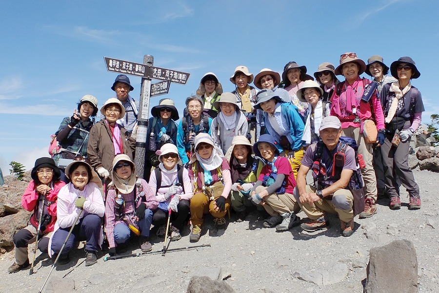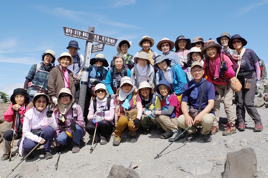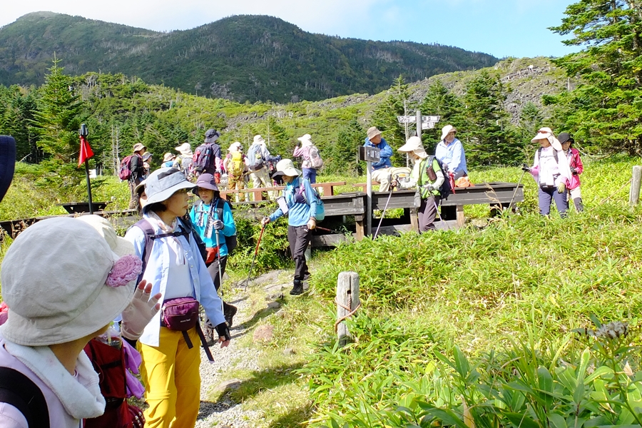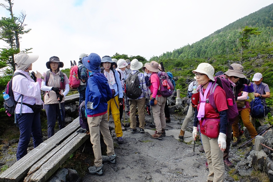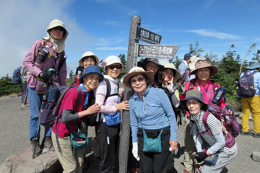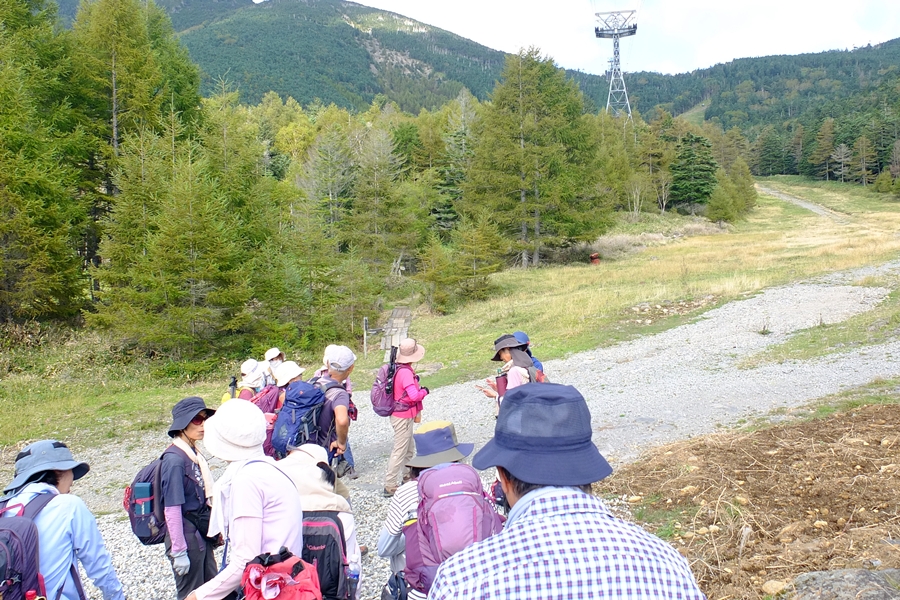 長かった今夏の猛暑も今週に入ってやや落ち着き、朝晩は涼しくなってきた。今回の山行は観光登山としても人気の北横岳で、9名のゲスト(麻生島さん、中野さん、村山さん、田中さん、飯田さん、鵜飼さん、井戸川さん、織田さん、増尾さん)を加え25名の参加◆満員御礼のバスは佐久南ICから中山道、ビーナスラインを経由して北八ヶ岳ロープウェイの山麓駅へ。片道切符1300円を買いArt.2237mの山頂駅へ到着。ロープウェイからは蓼科山の山容がよく見えた。山頂駅を出発して溶岩台地が広がる坪庭へと進むと、ごつごつした岩を覆う高山植物は花の時期を過ぎたものばかりだった◆坪庭から抜け出し10分ほどする低木林入り、登りが始まる。息を弾ませていると足元には白いシラタマノキ、黒いクロマメノキ、赤いゴゼンタチバナの実などが目につくようになる。ゴゼンタチバナのこの小さな草が、春先よく見かけるハナミズキやサンシュユと同じ仲間だと想像するのはなかなか難しい◆やがて北横岳ヒュッテに到着。日差しは強いが秋風がさわやかだ。しばし休憩して登り再開、30分程で三角点のある南峰の山頂に立つ(2472m)。山頂からは雄大な景色を堪能といいたいところだが、動きの速い雲に邪魔されがち。北峰2480mまで往復して集合写真を撮った後は山を下り、北横岳ヒュッテのベンチで昼食とした◆その後はすぐ近くの七ツ池まで足をのばし、山を下る。坪庭まで戻ったあたりで、たまたま井戸川さんと同郷の福島県浪江町町出身だという若者に出会った。キャンプしながら妙義山にものぼってきたという。なかなかの好青年で話もはずみ、時ならぬ王子様との出会いにわが女性陣はときめいていた◆山頂駅からはロープウェイ利用組5名、徒歩組20名に分かれて山麓駅へと下る。帰りのバスは往路と同じコースだったが、女神湖付近には白樺林が広がっていて見応えがあった。紅葉の季節を間近に控え、これから鮮やかに高原を染めていくことだろう。(南雲記)