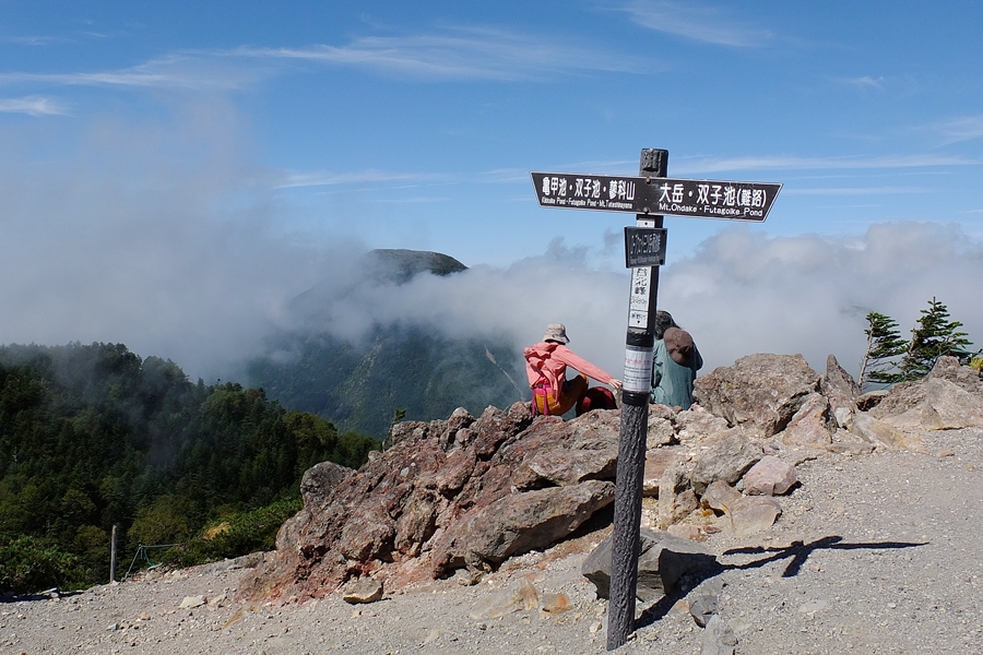 登山道は背の高い笹と石の段差がある細い道に難儀しました。開けた場所で休憩をとる