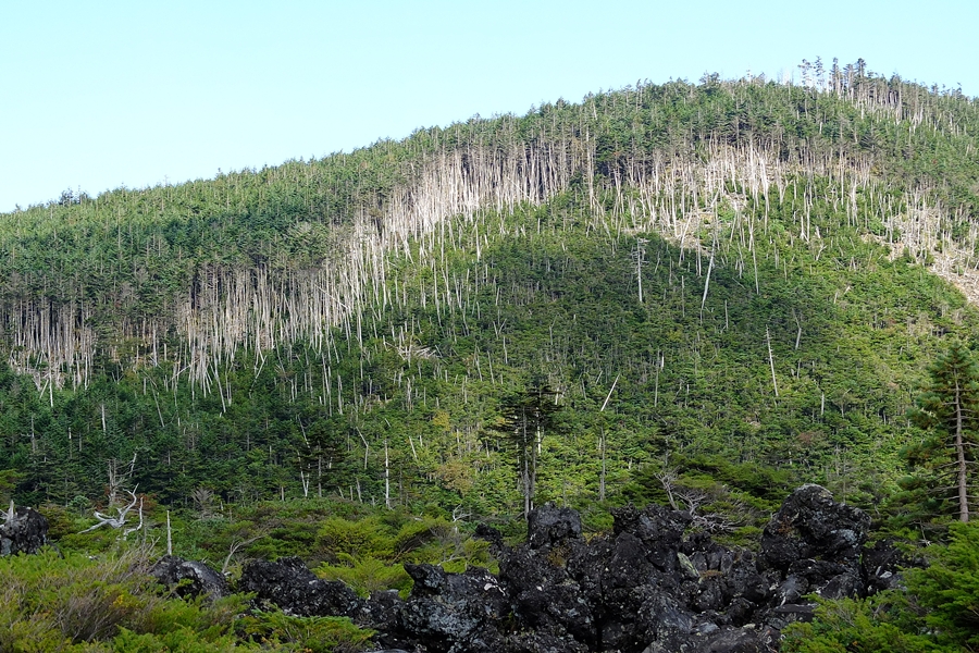 坪庭に戻り、周回コースの残りを歩くと周りの山の縞枯れ状況がよく分かる