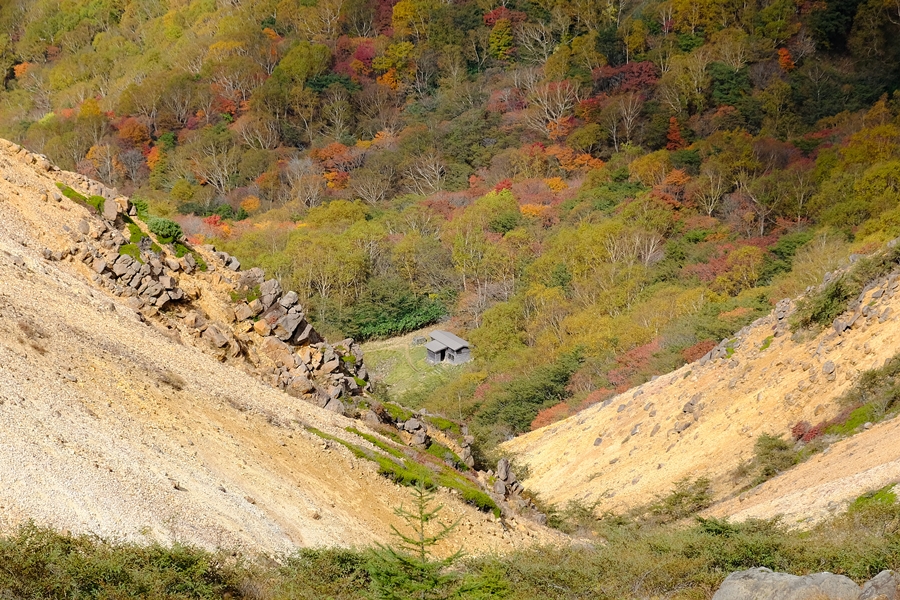 三斗小屋方面の谷底にある小屋が見えました