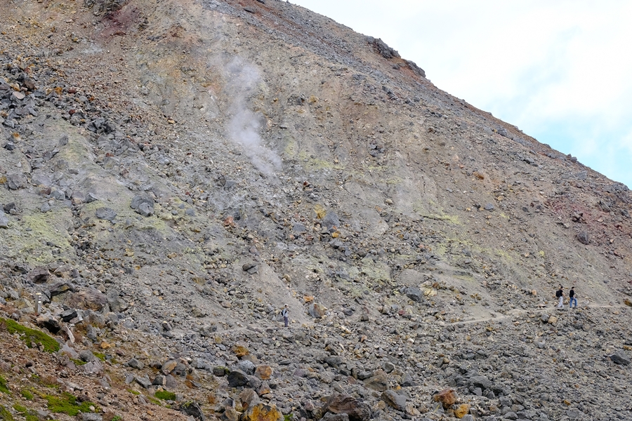 赤の斜面とバックには白いガスが流れます